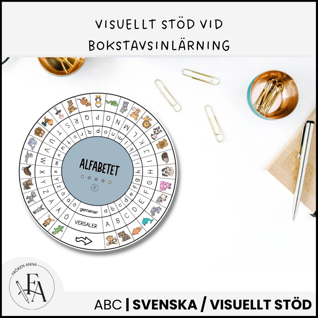 Med alfabetshjulet får eleverna stöd i att lära sig versaler och gemener. Skriv ut, laminera och låt eleverna ha vid sina bänkar eller bord när de läser och skriver.