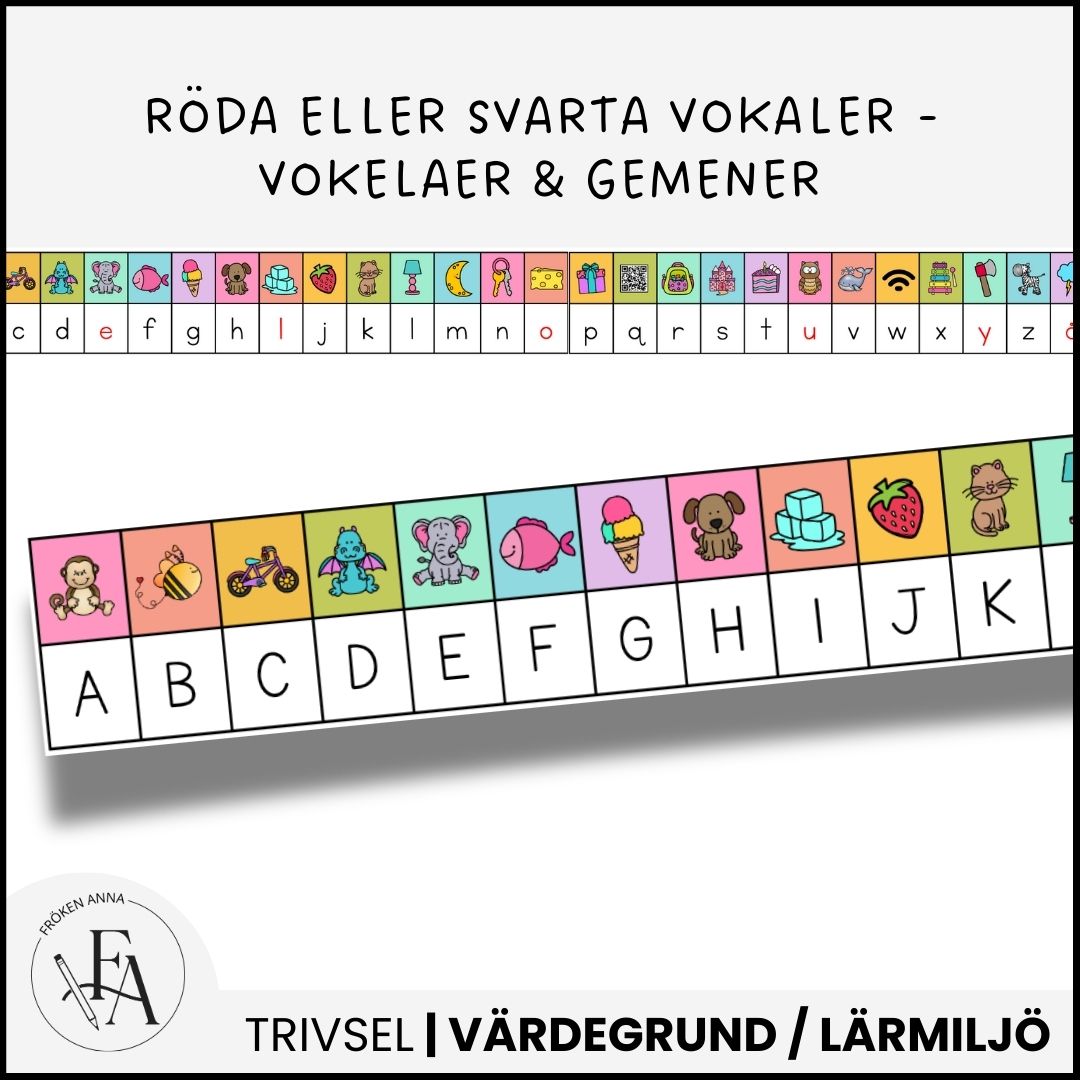 Alfabetsremsor är ett perfekt stöd för de elever som håller på att lära sig att läsa eller skriva. Skriv ut, laminera och sätt upp på elevernas bänkar och bord så de aldrig behöver fundera påg hur bokstäverna ser ut. Remsorna har alla alfabetets bokstäver i versaler och gemener, med antingen svarta eller röda vokaler.. Det är utformat i en tilltalande layout som engagerar eleverna att vilja använda det.