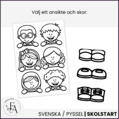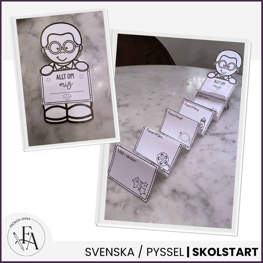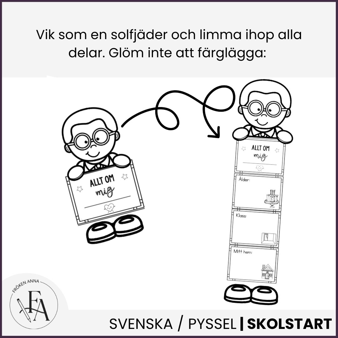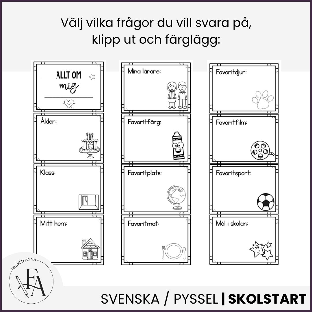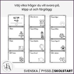 I detta pyssliga material får eleverna fylla i / rita fakta om sig själva och färglägga. Perfekt uppgift vid t.ex. skolstart. Detta material finns även på engelska.