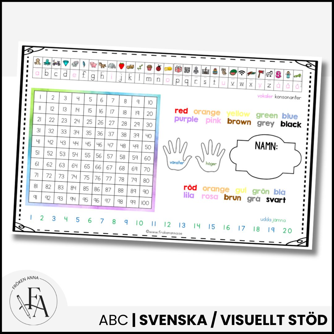 Bänkhjälp att fästa på elevernas bänkar eller bord med alfabetet, hundraruta, talen 1-20 samt färgerna på svenska och engelska. Bänkhjälpen är 18.5 x 11.5 cm och levereras i tre olika utföranden: med rosa, gröna och röda vokaler samt med två olika ramar att välja mellan.