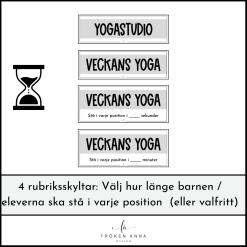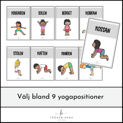 Skapa en hörna för barnyoga i klassrummet eller på förskoleavdelningen där barnen tillåts ta en paus när behov av det uppstår. I detta paket ingår 9 olika yogapositioner för barn som du kan bygga en egen yogaserie av.