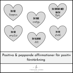 Sätt upp nummerordningscirklarna på väggen och de valda övningarna under, och välj någon av de fyra rubriksskyltarna och fyll i hur länge barnen ska stå i varje position. (Använd timglas eller tidtagarur för tidtagning). Sex olika hjärtan med peppande affirmationer att dekorera med ingår också.