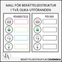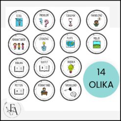 Bena ut viktiga begrepp och delar ur en berättelse med denna stödstruktur. Materialet består av 14 bubblor (10×10 cm) som kan sättas på blom- eller glaspinnar eller på tavlan med magnettejp, samt en mall för en berättelsestruktur i fyra olika utföranden.