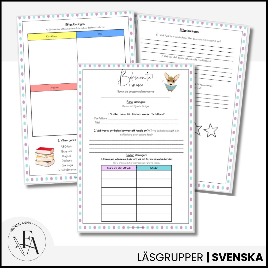 Tre arbetsblad att dela ut till elever som i grupp läser samma bok, eller kapitel ur en bok. Eleverna får besvara frågor före, under och efter läsningen.