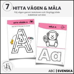 För varje bokstav (A–Ö) ingår nio arbetsblad: