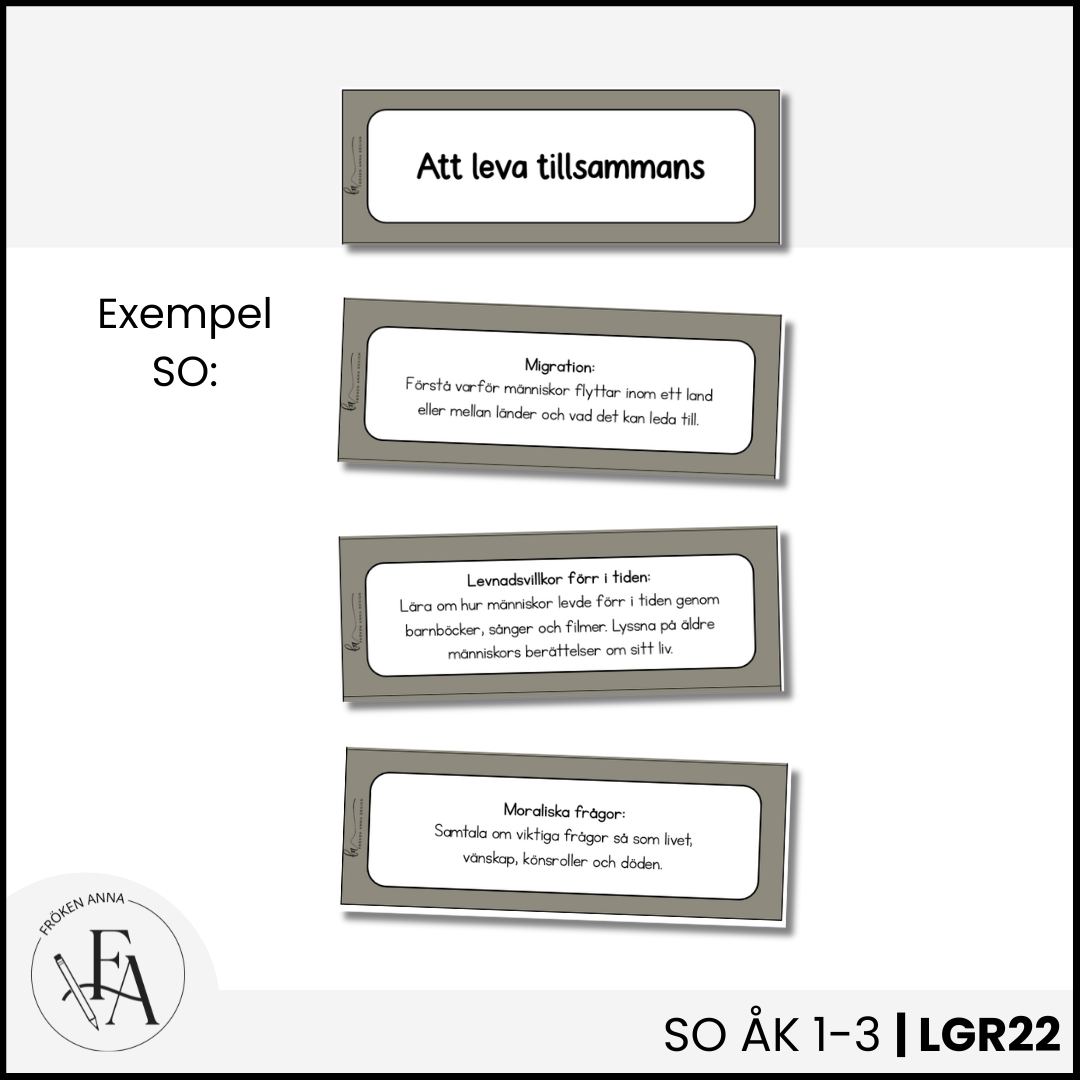Synliggör det centrala innehållet på ett elevnära språk. I detta paket ingår hela det centrala innehållet för ämnet SO för årskurs 1-3. Varje delmoment finns på ett eget kort, perfekt att sätta upp på tavlan när ni arbetar med de olika områdena. Använd detta material för att tydliggöra och visualisera Lgr22.