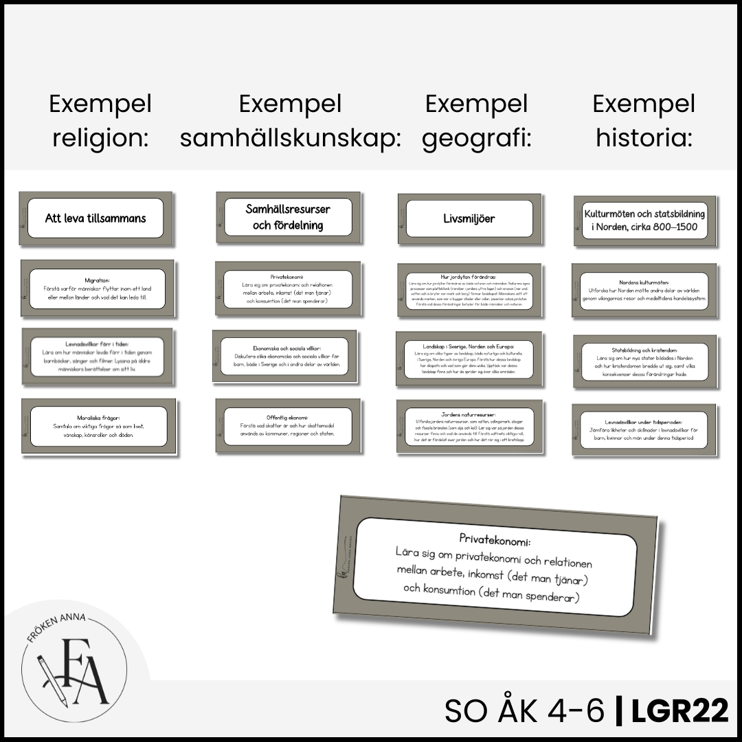 Synliggör det centrala innehållet på ett elevnära språk. I detta paket ingår hela det centrala innehållet för ämnet SO för årskurs 4-6. Varje delmoment finns på ett eget kort, perfekt att sätta upp på tavlan när ni arbetar med de olika områdena. Använd detta material för att tydliggöra och visualisera Lgr22.