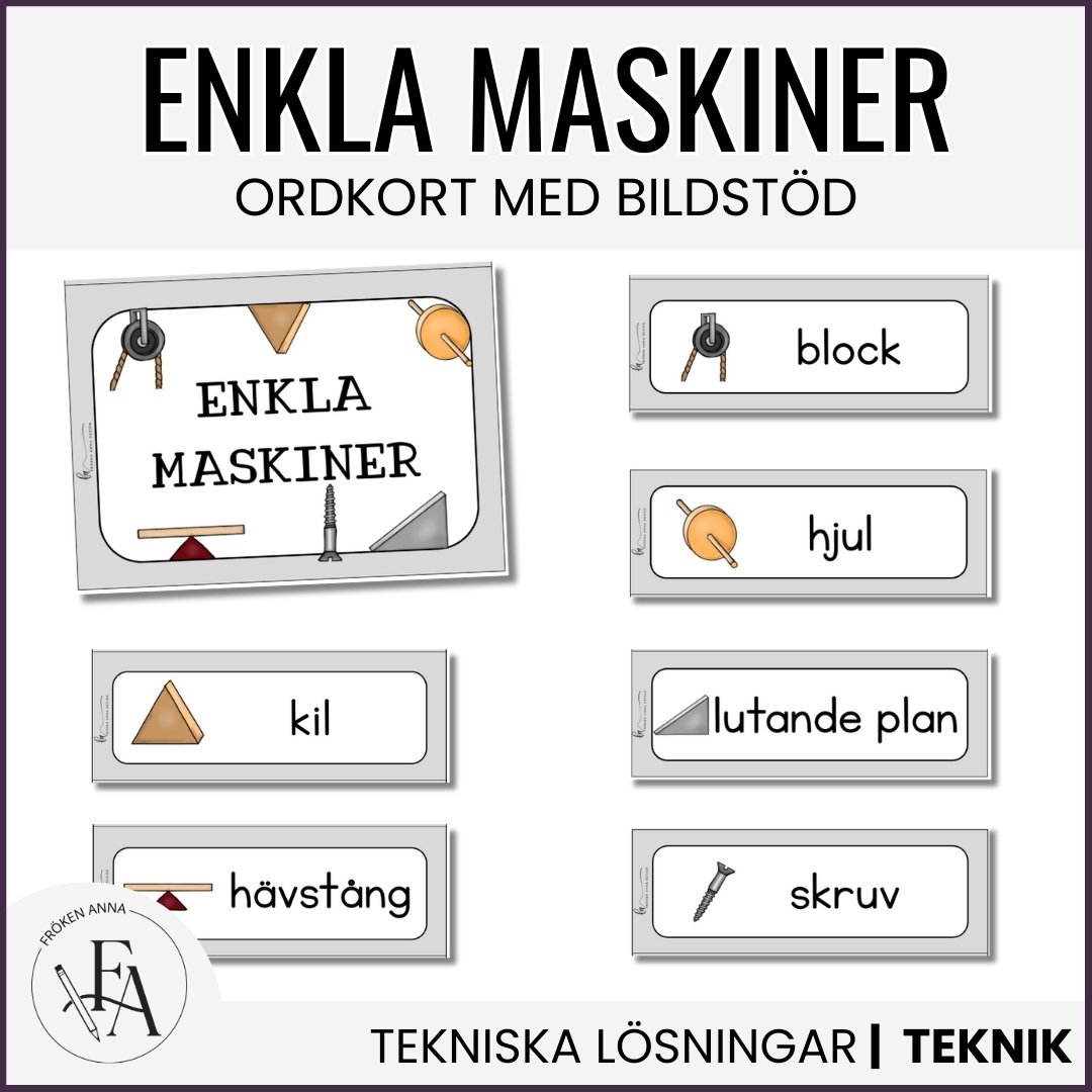 - 6 ordkort med illustrationer och maskinernas namn: Block, Hjul, Kil, Lutande plan, Hävstång och Skruv.