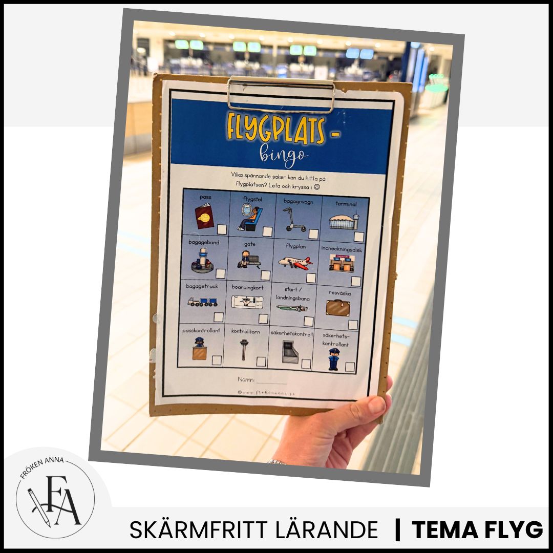 Flygplatsbingot passar perfekt för barn i förskole- och lågstadieåldern som reser med flyg. Det gör väntetiden roligare och hjälper barnen att lära sig mer om flygplatsens olika delar.