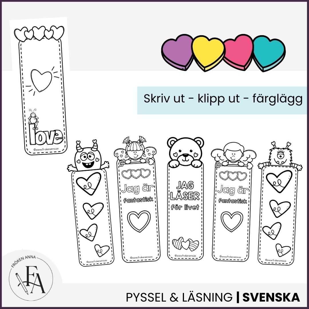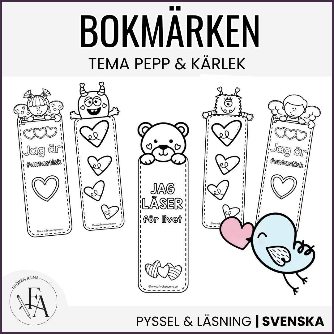 I detta set ingår 6 olika bokmärken med kärleks- och pepptema. Skriv ut, klipp ut, färglägg (och laminera vid behov 🙂 )