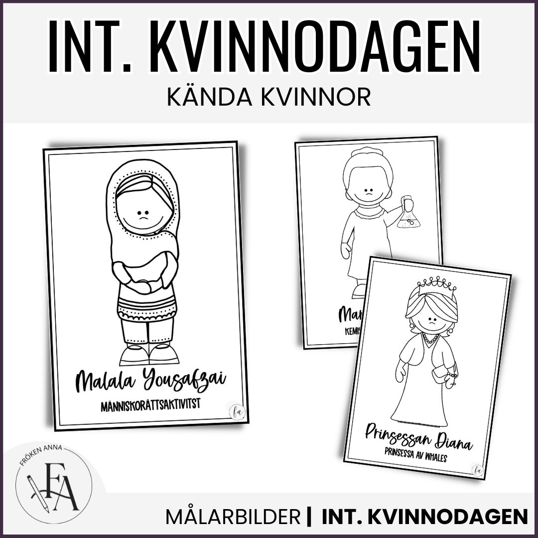 Motiv över åtta historiska kvinnor samt tre med jämlikhet – budskap ingår. Totalt 11 färgläggningsbilder