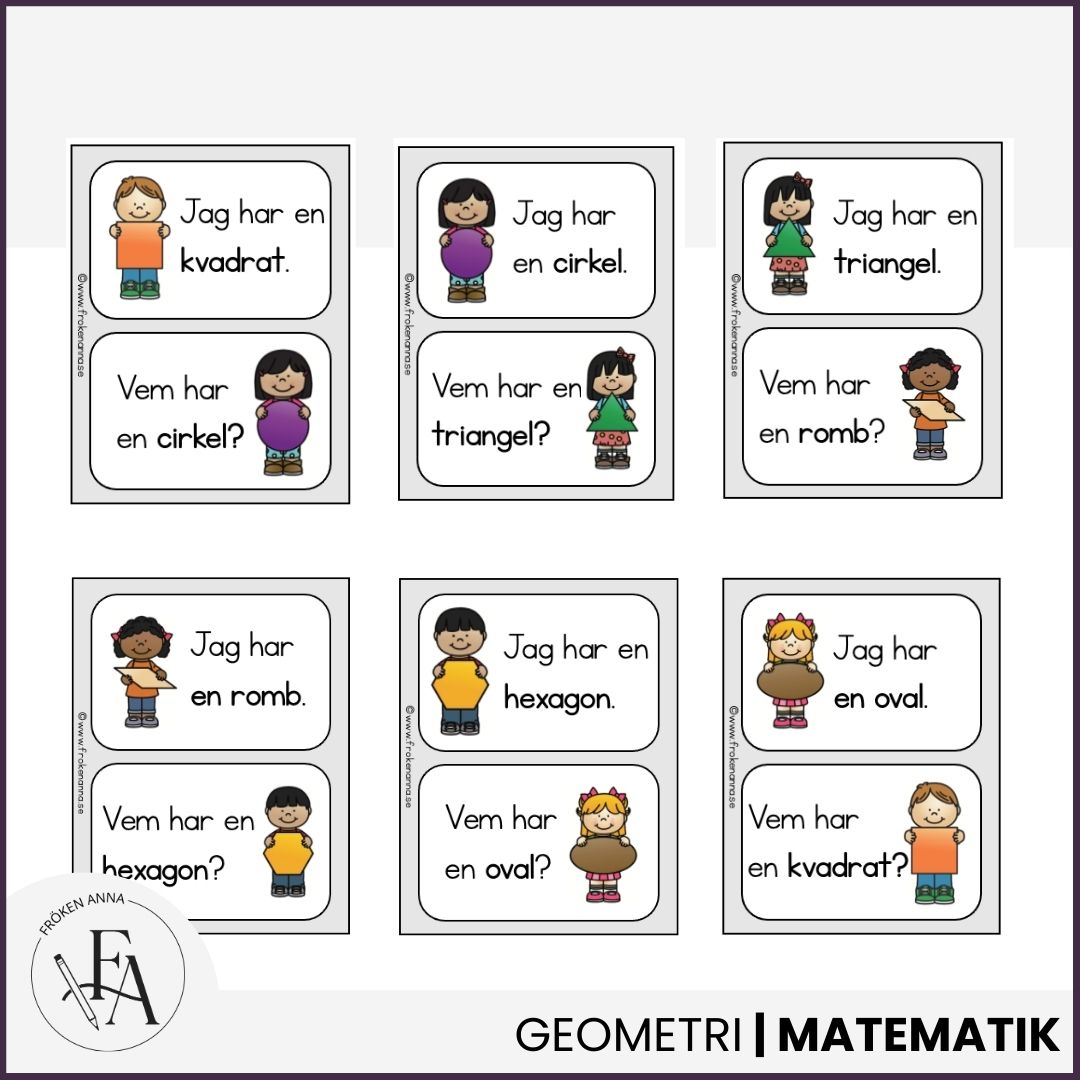 Träna på formernas namn i grupper om sex barn / elever per grupp. Ta ett kort var och gå varvet runt. (Börja med vallfritt kort)