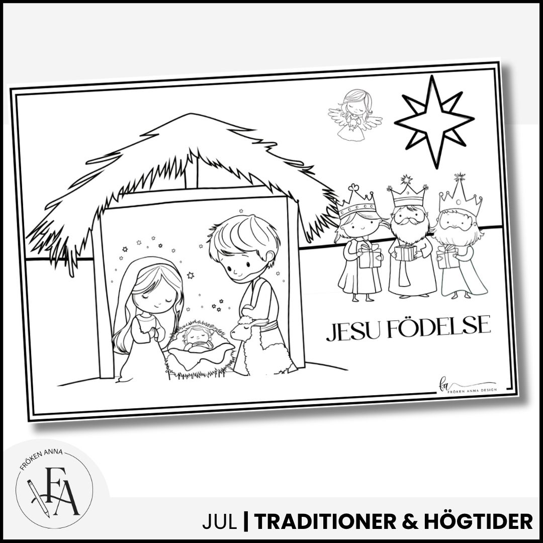 En fin målarbild som illustrerar Jesu födelse, perfekt för julens tema i klassrummet, på fritids eller hemma. Skapa julstämning och låt barnen färglägga denna stämningsfulla bild med Maria, Josef, och de tre vise männen. Passar utmärkt som en del av pyssel eller undervisning kring julens berättelser.