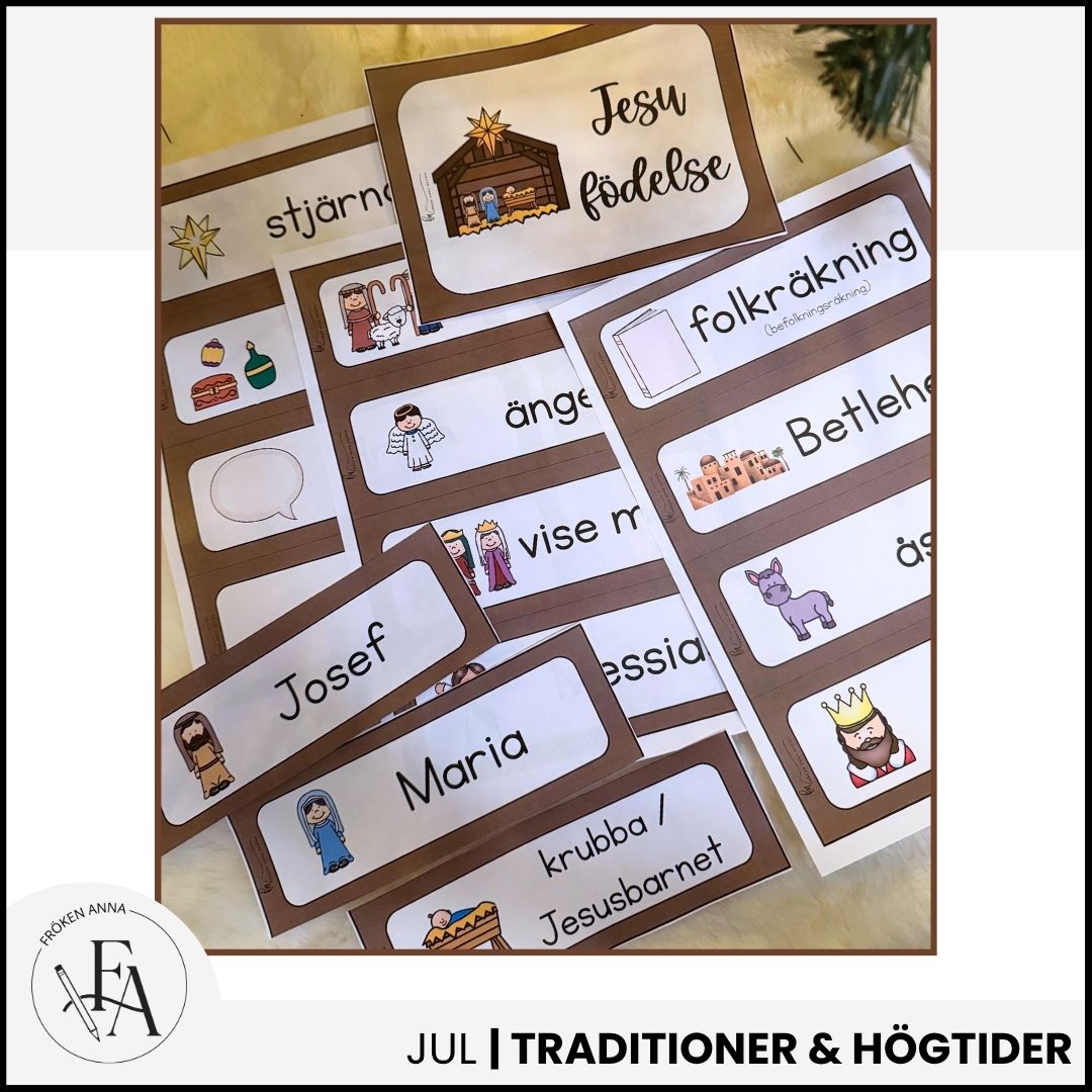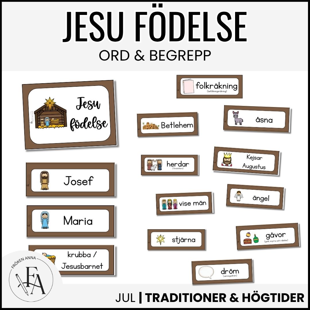 Ett pedagogiskt material som förklarar viktiga ord och begrepp kopplade till berättelsen om Jesu födelse, kompletterat med tydligt bildstöd. Perfekt för undervisning kring julen, där eleverna får möjlighet att förstå och använda begrepp som ”Maria,” ”Josef,” ”krubba,” ”Betlehem” och ”de vise männen.” Materialet är anpassat för att underlätta språkutveckling och förståelse, särskilt för yngre barn eller elever i behov av extra stöd. Passar utmärkt i klassrummet eller hemma under julens tema.