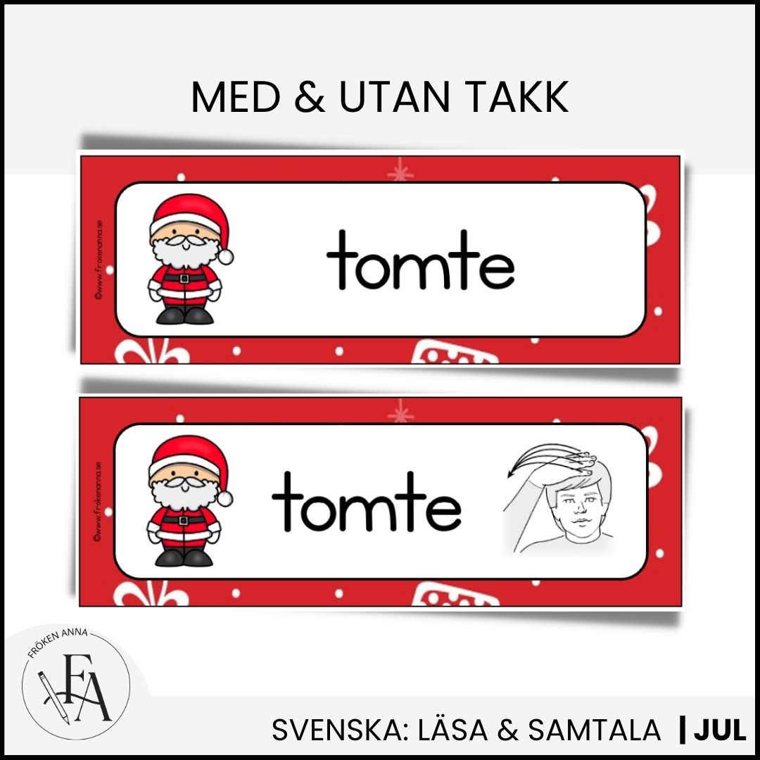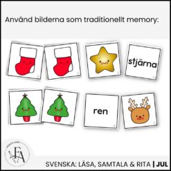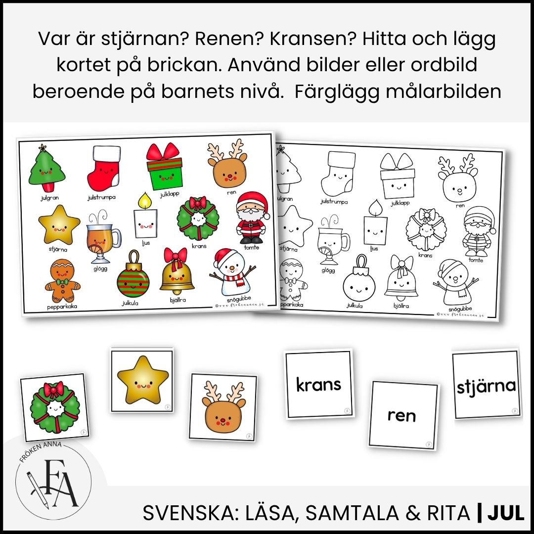 - Sök och hitta: Hitta julbilderna och lägg rätt bild på brickan. Använd bilderna för yngre barn och ordkorten för äldre.