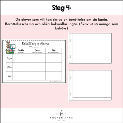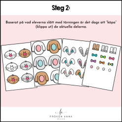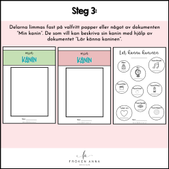 I materialet ”Kaninaffären” avgör slumpen (tärningsslag) vilka kanindelar barnen/eleverna får ”köpa” för att skapa sin unika kanin. Därefter är det dags att limma fast alla delar på det separata arbetsbladet ”Min kanin”. Läs- och skrivkunniga barn/elever som vill kan sedan fylla i information om sin kanin i arbetsbladet ”Lär känna”, och för de elever som vill ha en extra utmaning medföljer ett berättelseschema och bokmallar för att kunna skriva en berättelse om kaninen.