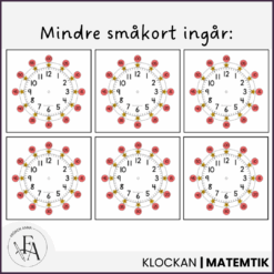 Klocketiketter att sätta upp runt väggklockan när eleverna behöver träna på klockan. Färgtemat är i serien ”Rainbow”.
