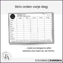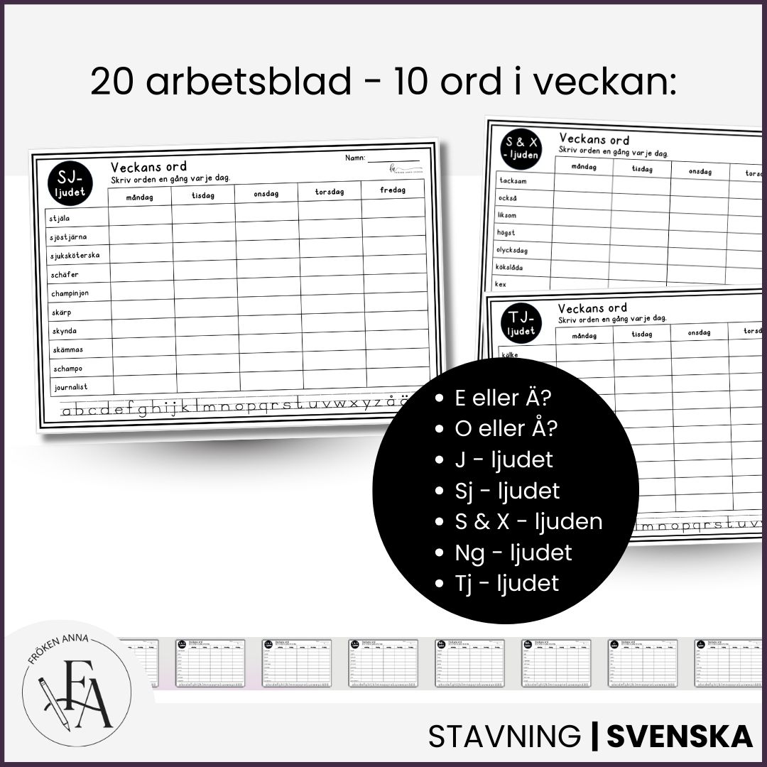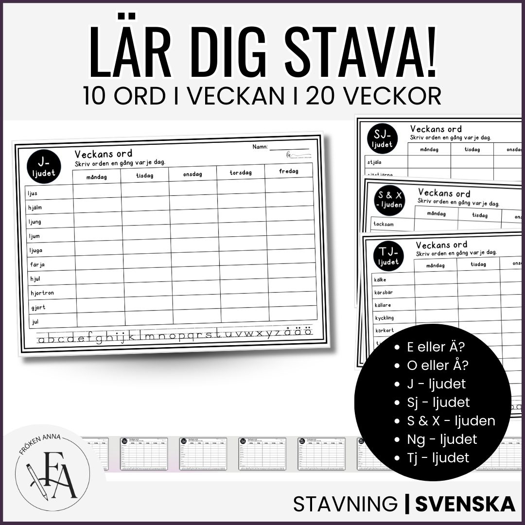 Detta omfattande material innehåller 20 arbetsblad, där varje blad fokuserar på 10 ord kopplade till vanliga stavningsutmaningar i svenskan. Eleverna arbetar med samma ord under en vecka, vilket skapar repetition, trygghet och progression.
