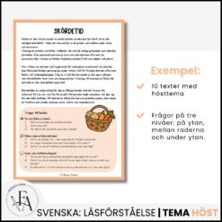 Ett pedagogiskt läsförståelsematerial med hösttema som kombinerar texter, ordförklaringar och frågor på tre nivåer – fakta, tolkning och reflektion. Materialet lyfter fram höstens naturfenomen, djurens beteenden, skörd, väder och traditioner och ger eleverna möjlighet att utveckla sin läsförmåga på ett lustfyllt sätt. Perfekt för låg- och mellanstadiet, enkelt att skriva ut och direkt användbart i klassrummet eller vid hemundervisning. Facit ingår.