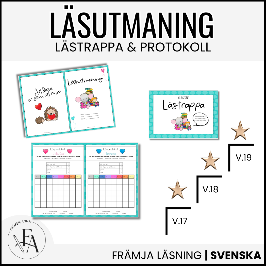 Eleverna fyller i ett läsprotokoll för att hålla koll på när, hur och vad de läser, och den totala lästiden samlas i klassrummet. Materialet innehåller även skyltar för veckans barnboksförfattare och böcker vi läst, vilket skapar samtal och engagemang kring högläsning.