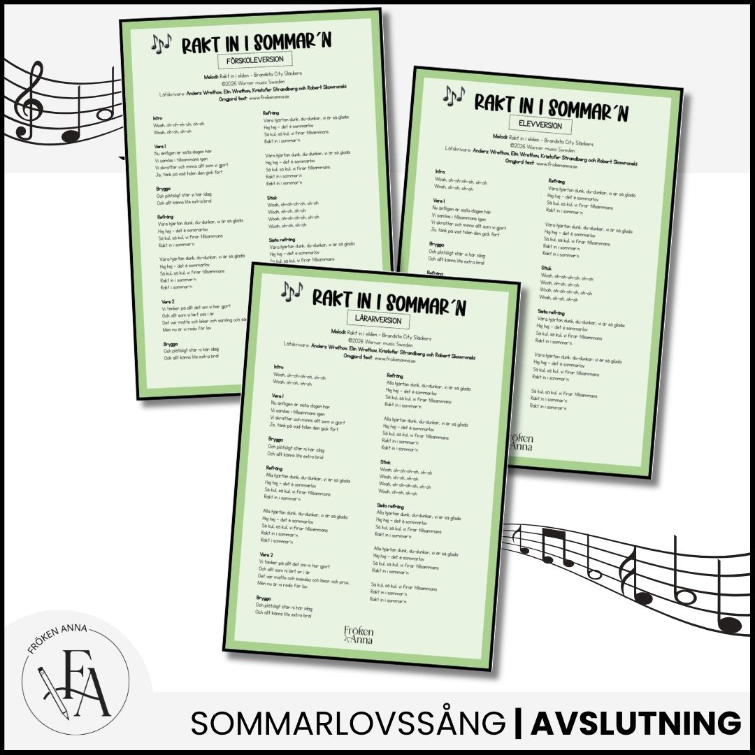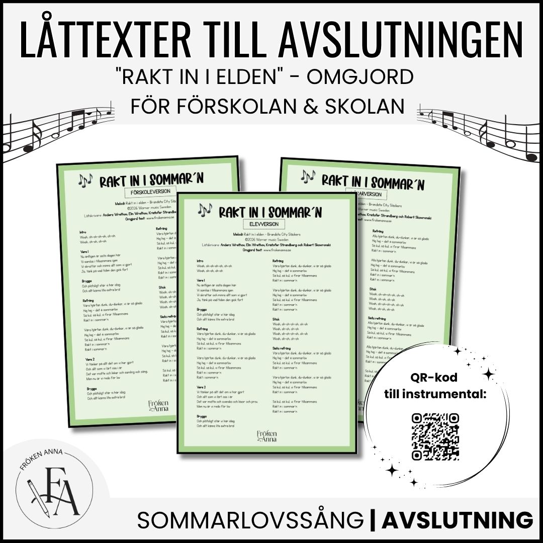 En omgjord låttext av Brandsta city släckers ”Rakt in i elden” att sjunga på sommaravslutningen. Tre versioner ingår: för elever, lärare i skolan och förskolan.