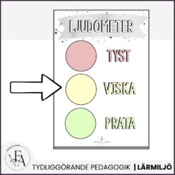 Reglera ljudnivån i klassrummet med en ljudometer och sätt pilen på önskad ljudnivå. Materialet levereras med och utan bildstöd.