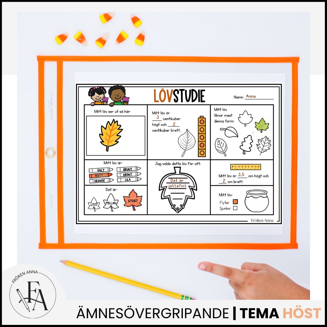 Ett arbetsmaterial som låter barn utforska lövens egenskaper genom observation, mätning och dokumentation. Barnen får hämta ett löv från naturen och utforska dess färg, storlek, form samt egenskaper såsom om det flyter eller sjunker.