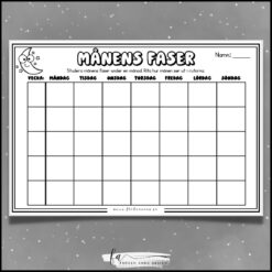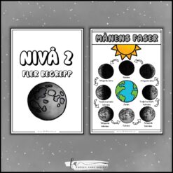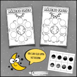 I detta arbetsmaterial får eleverna lära sig om månens olika faser. Materialet är uppdelat i två nivåer beroende på om man vill lära sig fler/färre begrepp. Färglägg månen själv eller använd de färdiga månarna och klipp ut och limma fast.