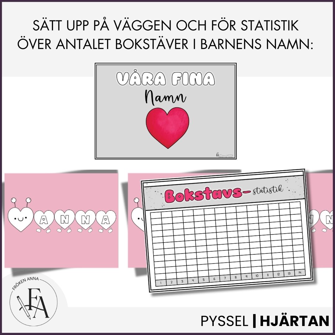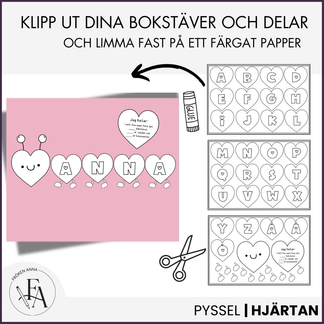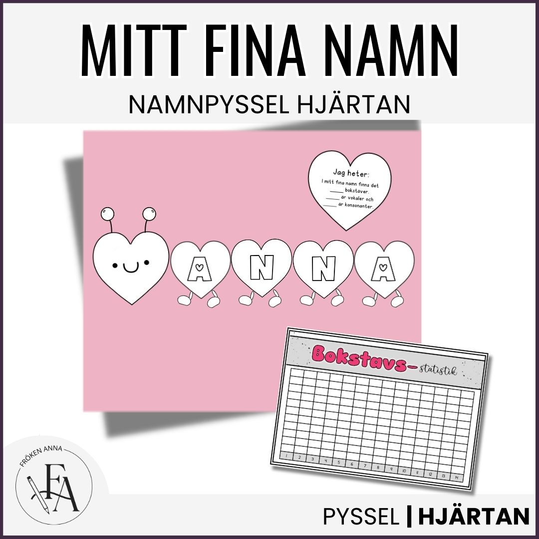 Projektet ”mitt fina namn” är en kreativ pysseluppgift där ni väver in både lite svenska och matematik. Först får eleverna färglägga bokstäverna i sitt namn och sätta ihop det till en hjärtlarv, därefter limma fast dem på ett färgat papper. Räkna antalet bokstäver, vokaler och konsonanter och fyll i informationen, klipp ut och limma fast på pappret.