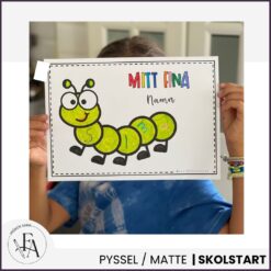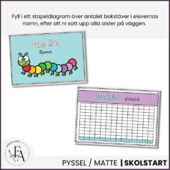 Projektet ”mitt fina namn” är en kreativ bild och matematikuppgift i ett! Först får eleverna fylla i bokstäverna i sitt namn i en tusenfoting (Ingår olika tusenfotingar med plats för 2-14 bokstäver) och färglägga sin bild. Därefter kan ni sätta upp alla elevers alster under den medföljande klassrumsskylten ”Våra fina namn”, och fylla i stapeldiagrammet över hur många bokstäver elevernas namn innehåller. Ha så skoj!