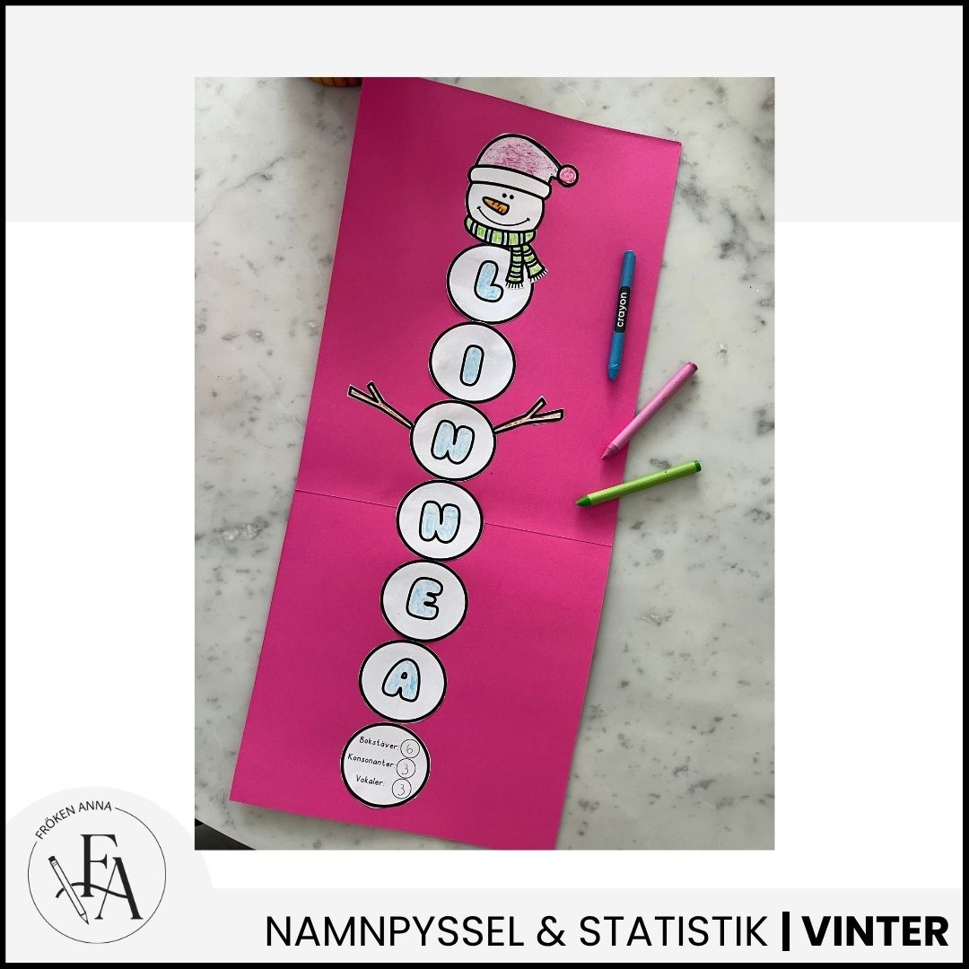 Projektet ”mitt fina namn” är en kreativ pysseluppgift där ni väver in både lite svenska och matematik. Först får eleverna färglägga snöbollar med bokstäverna i sitt namn och därefter limma fast dem på ett färgat papper. Räkna antalet bokstäver, vokaler och konsonanter och fyll i kulan längst ner.