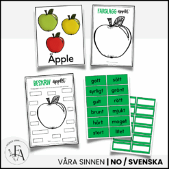 Äppelbeskrivning: Inspektera ett äpple tillsammans i helklass/grupp och beskriv dess utseende med adjektiv. Fyll därefter i arbetsbladen (två nivåer)