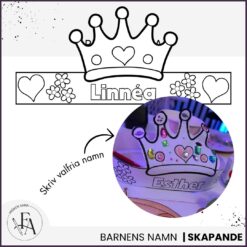 Skapa roliga namnkronor som barnen får färglägga och dekorera. Perfekt att ha på t.ex. kalas, när något barn fyller år i skolan eller förskolan eller vid en terminsstart. Filen är redigerbar i PowerPoint så du själv kan skriva in barnens namn innan du skriver ut dokumentet.