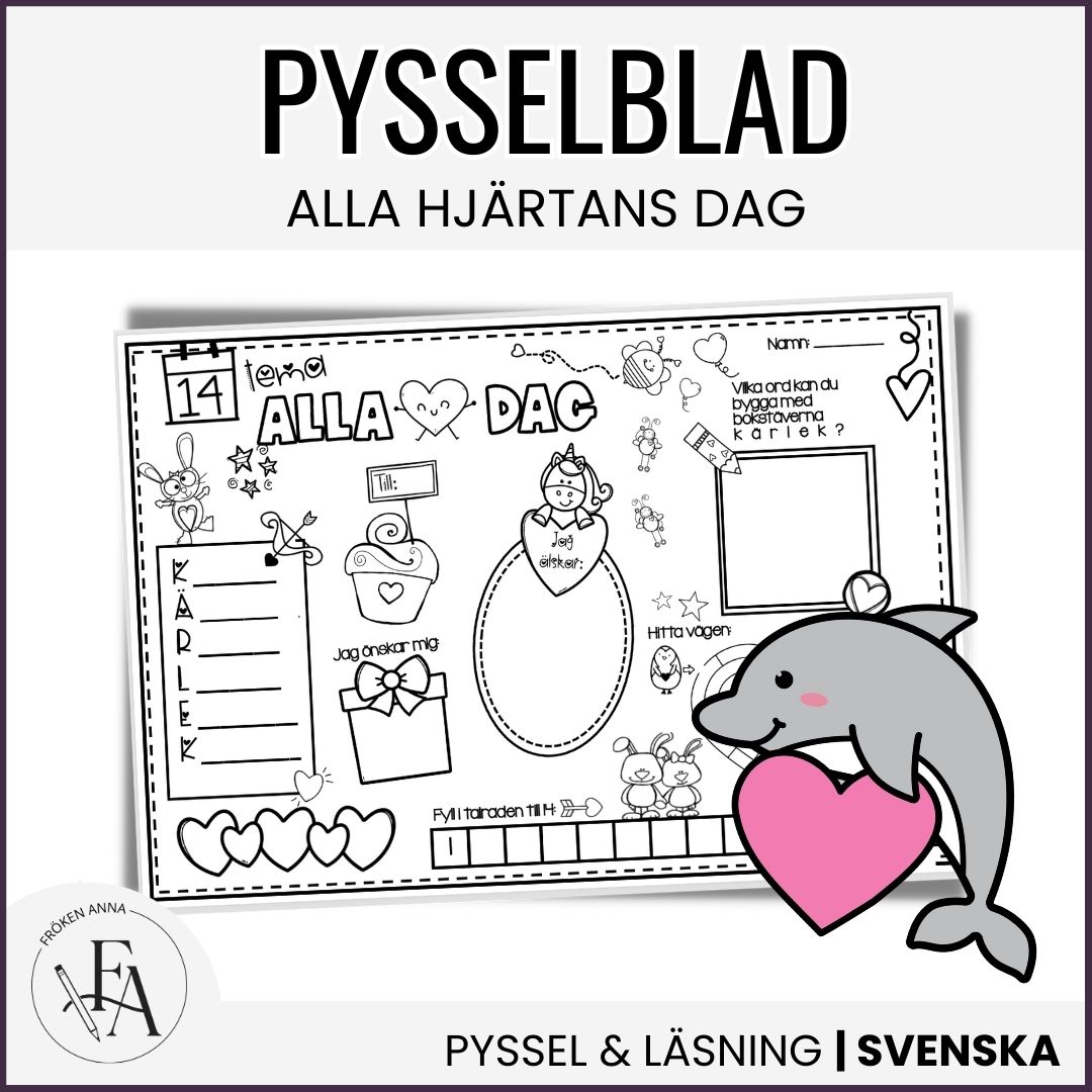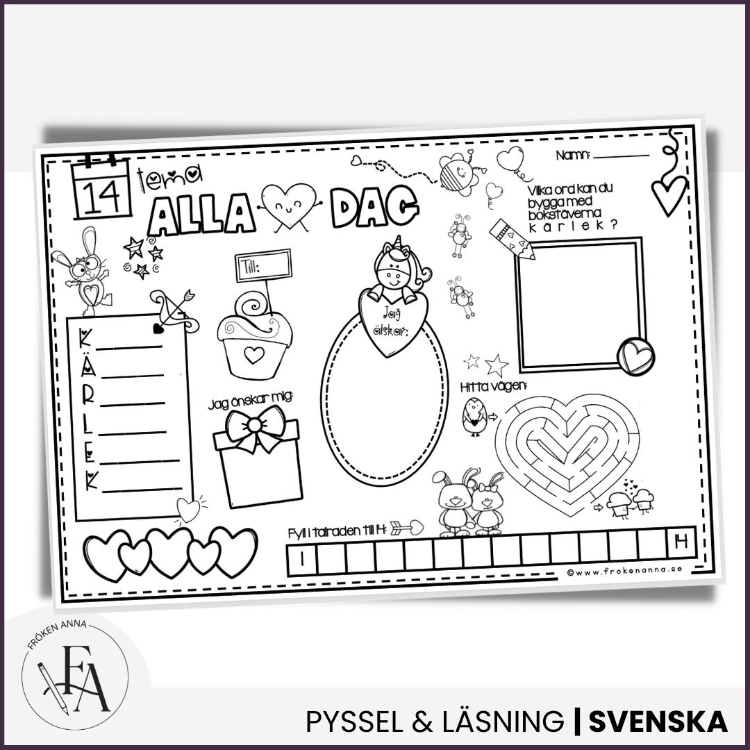 Lustfyllt arbetsblad att göra i samband med alla hjärtans dag. Ingen förberedelse behövs, bara att skriva ut och använda! Tips är att skriva ut i A3 för den bästa upplevelsen 🙂