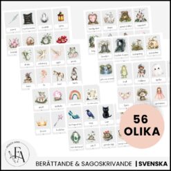 Materialet innehåller 56 bildkort med karaktärer, miljöer och viktiga attribut – perfekta för muntligt berättande, skrivande, språkutveckling och kreativ lek.
