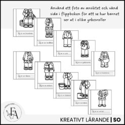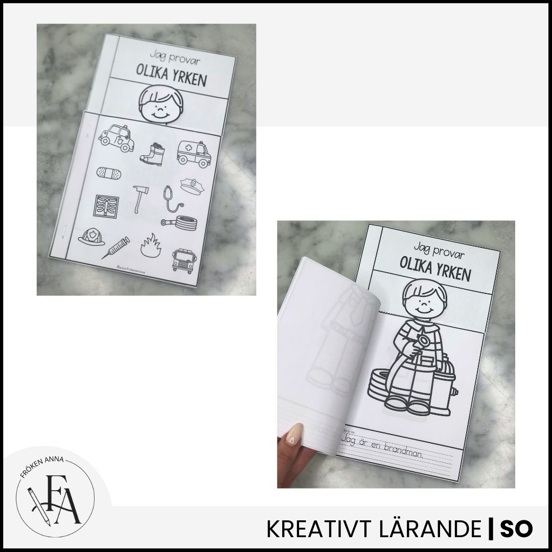 Eleverna får prova att se sig själva i olika yrkesroller genom att klippa ut ett foto av sitt ansikte (eller använda färdiga ansiktsmallar) och placera det i flikboken. Därefter färglägger de kläderna och skriver vad de är – med fokus på handstil, yrkesbegrepp och identitet.