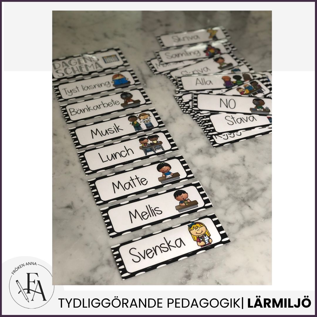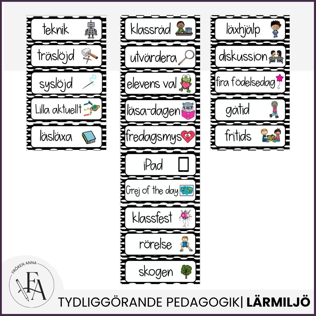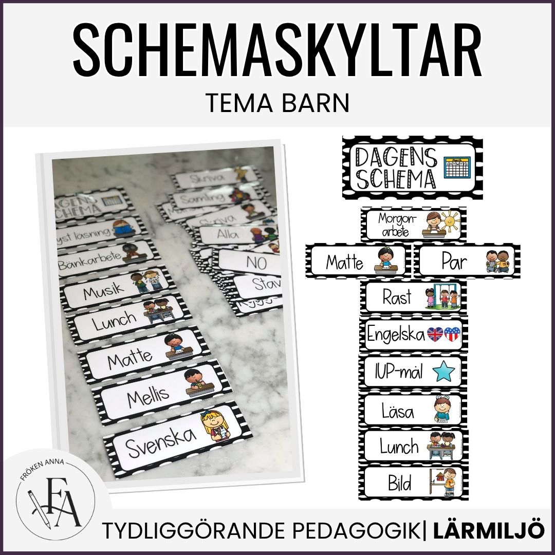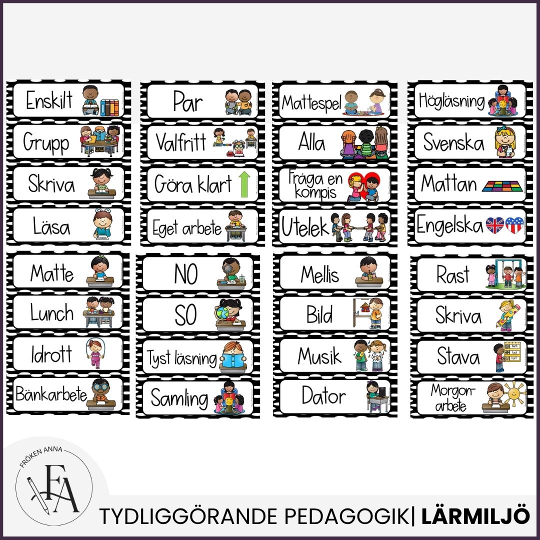 I detta paket ingår 64 schemaskyltar med text och bildstöd. Bilderna har en tilltalande layout som passar yngre elever.