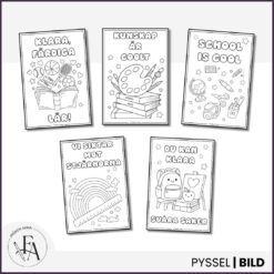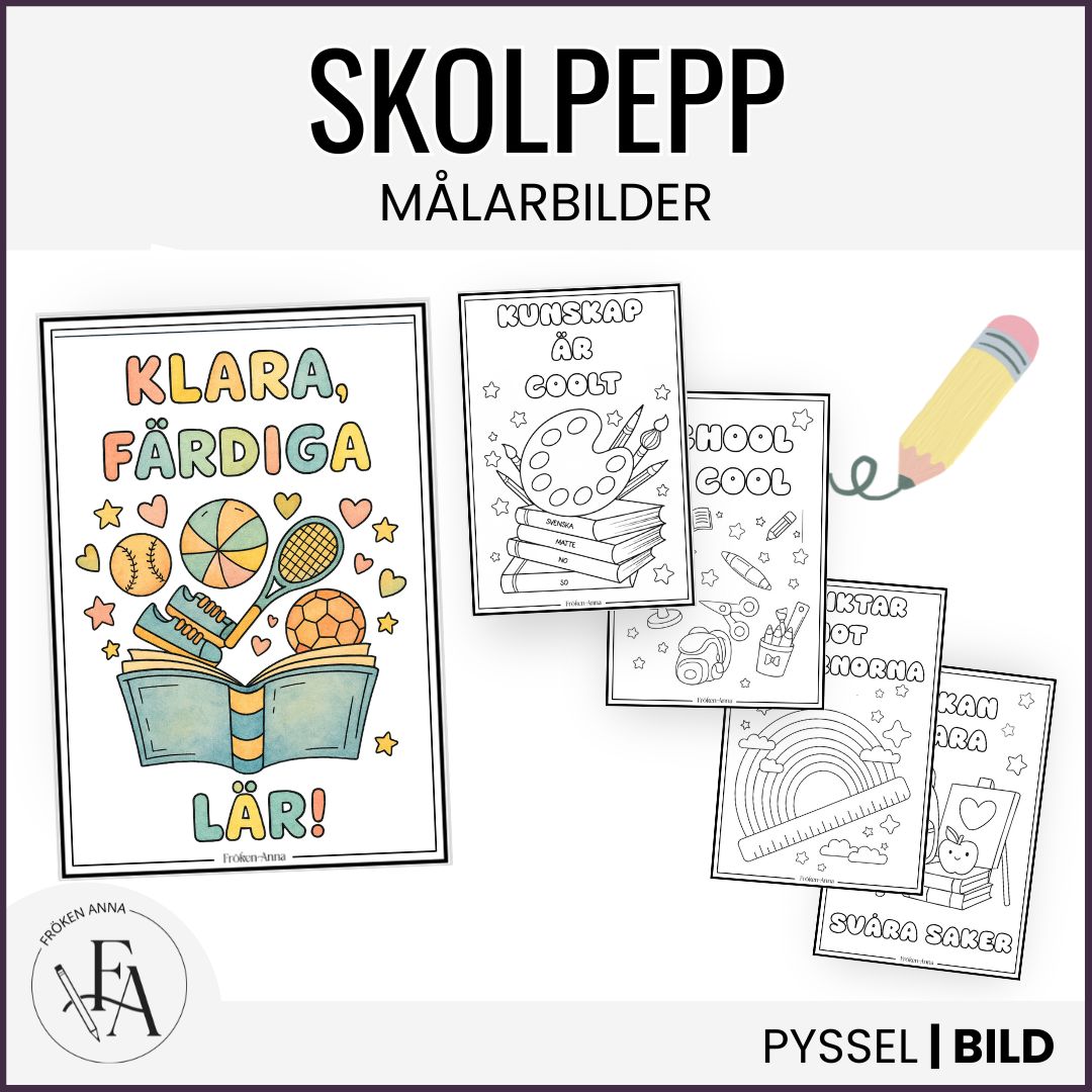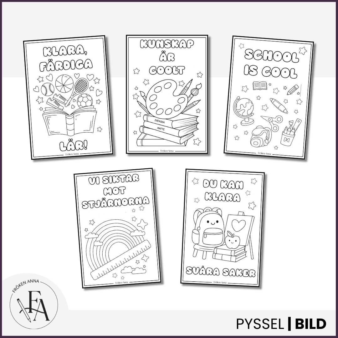 Detta material innehåller fem härliga målarbilder med skoltema – perfekta att använda första skoldagen, vid uppstart av terminen eller som en rolig och kreativ paus i klassrummet.