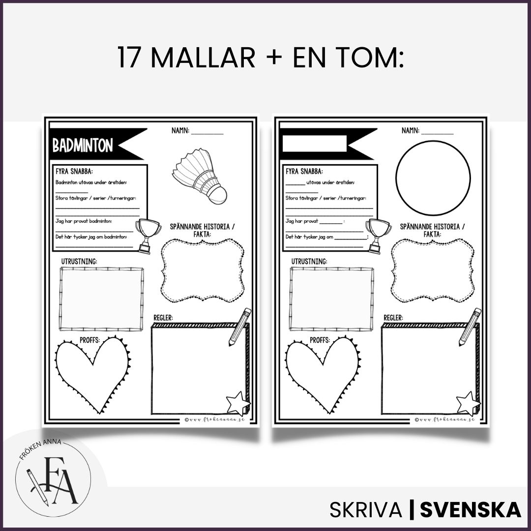 Låt eleverna utgå från sitt vetande om olika sporter eller sök ny spännande fakta att skriva om. I detta material ingår färdiga skrivmallar till 17 olika sporter. Till vissa sporter ingår flera olika bilder att välja bland. Den som önskar kan även använda den tomma skrivmallen som också ingår, och den som vill skriva mer kan använda de extra skrivbladen. De elever som behöver kan använda det medföljande skrivstödet.