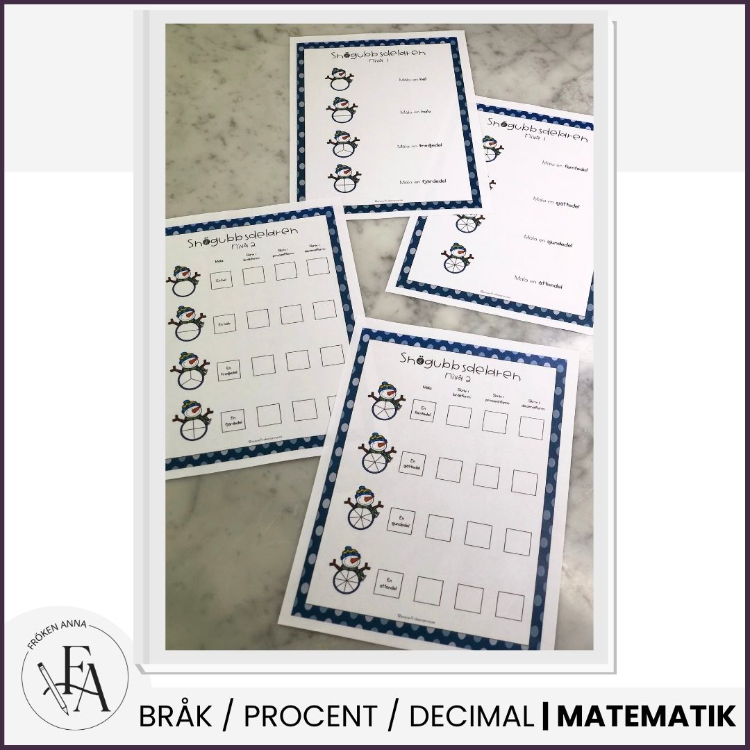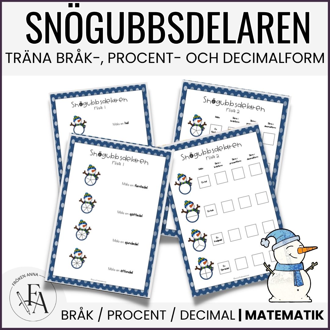 Snögubbsdelaren är ett visuellt material i två nivåer. Nivå ett består av två arbetsblad där eleverna ska måla snögubbens olika delar, medan de i nivå två även ska omvandla bråktalen till procent- och decimalform.