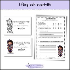 I paketet ingår en minibok i färg att läsa tillsammans med barnen, innan de själva får färglägga bilderna till sin egen bok och träna på att berätta texten / informationen till bilderna. Det ingår även en mall med tomma rader om barnen / eleverna kan skriva själva.