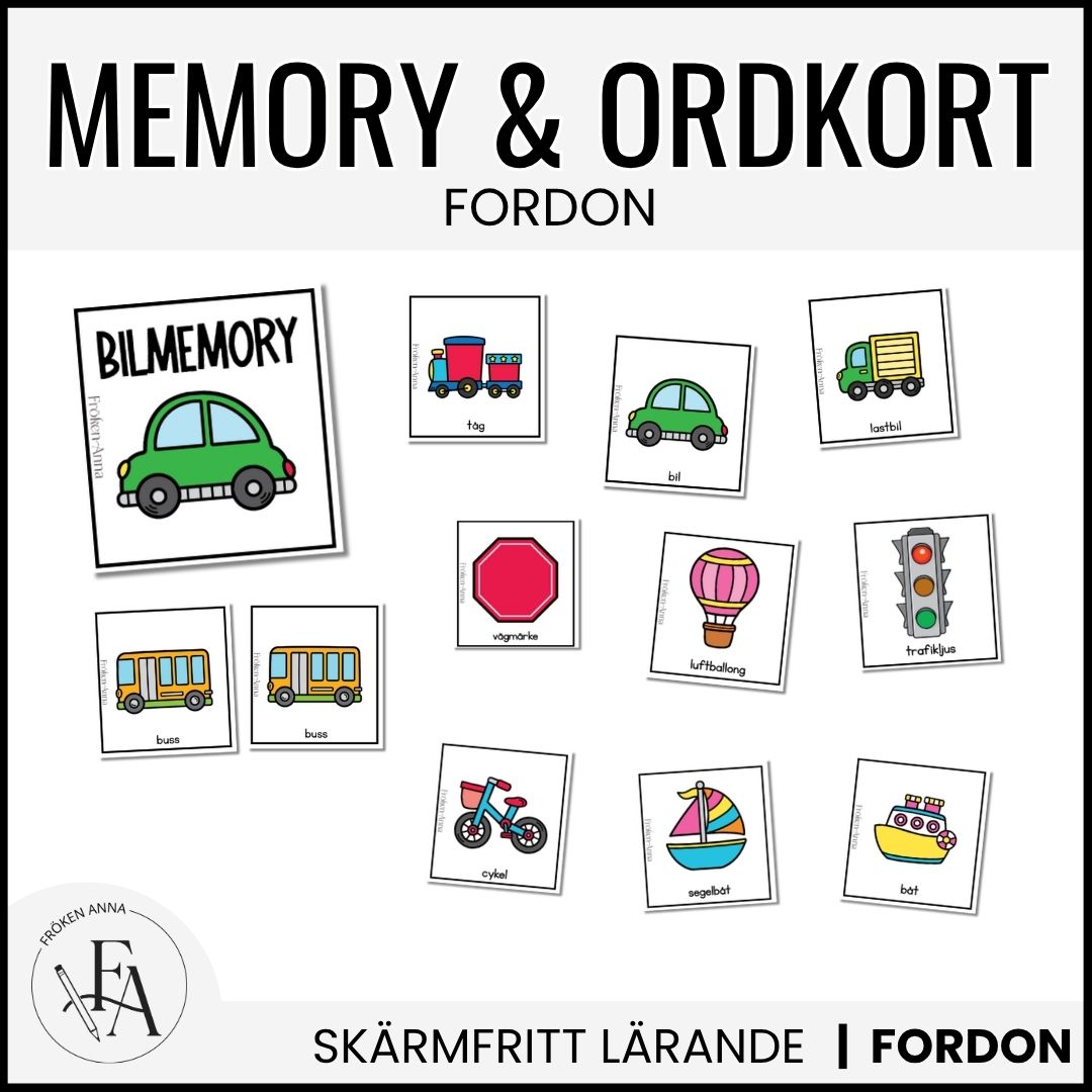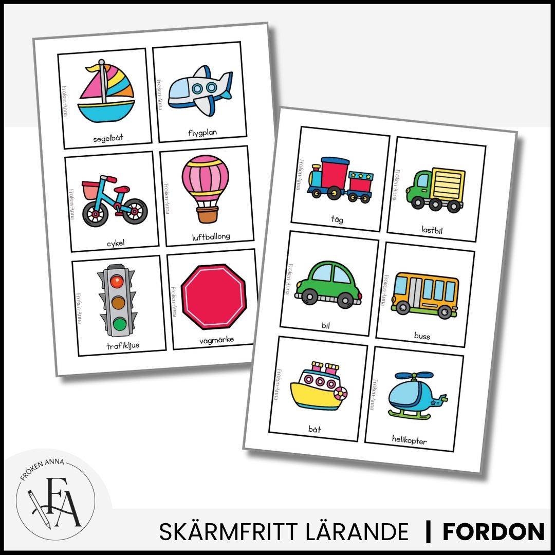 Träna minnet med färgglada bilder på fordon – perfekt både före och under resan.