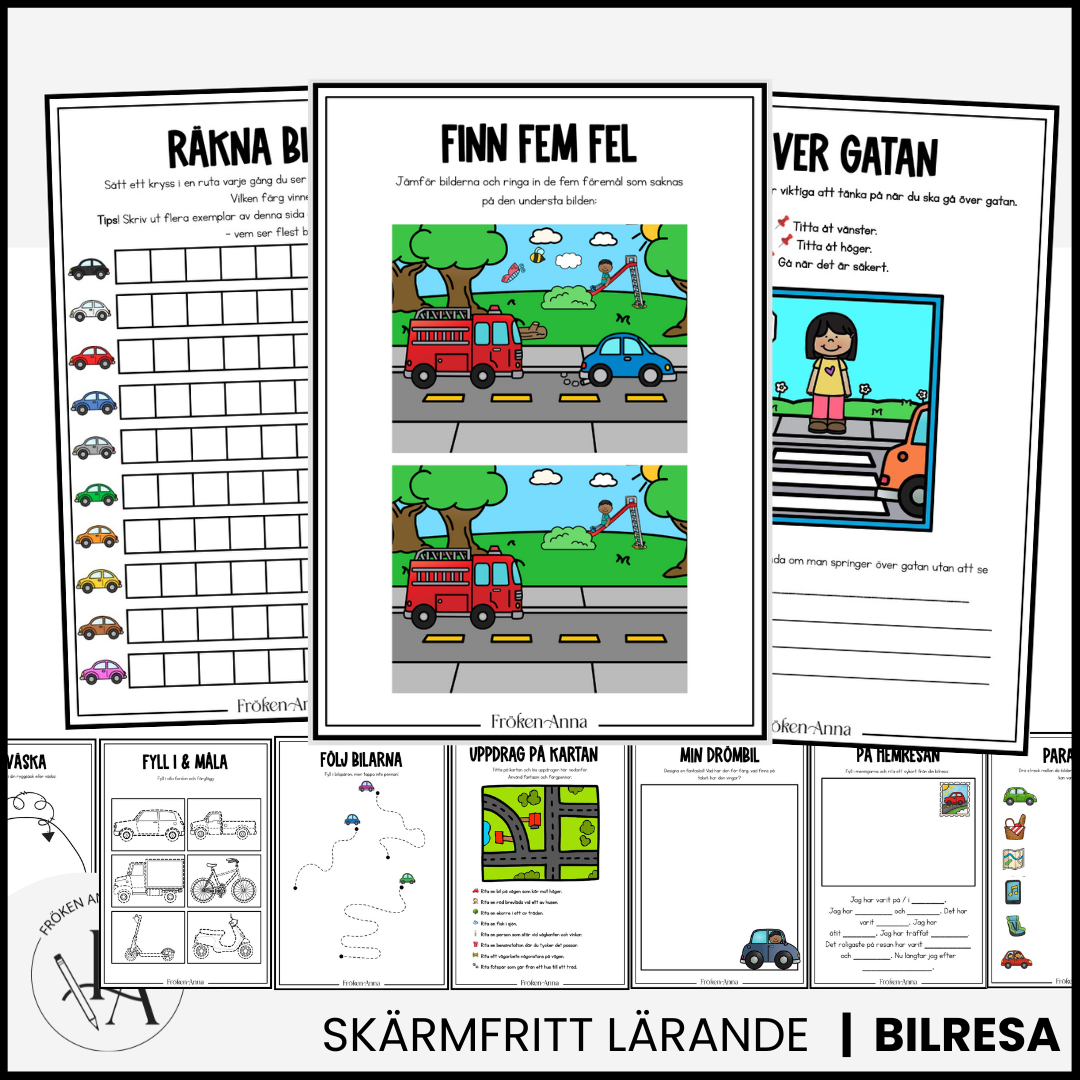 Detta paket passar barn i förskole- och lågstadieåldern, både för familjer som ska åka på bilresa och för pedagoger som vill arbeta med fordon eller göra utflykter.