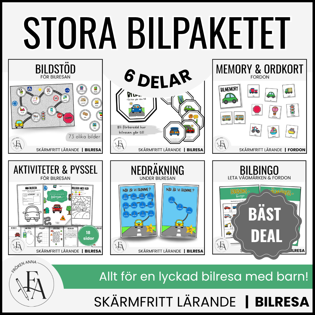 I det här paketet får du allt från bildstöd och berättelser till pyssel, spel och aktiviteter – perfekt för att förbereda barnen, hålla dem sysselsatta och skapa en roligare resa för alla i bilen.