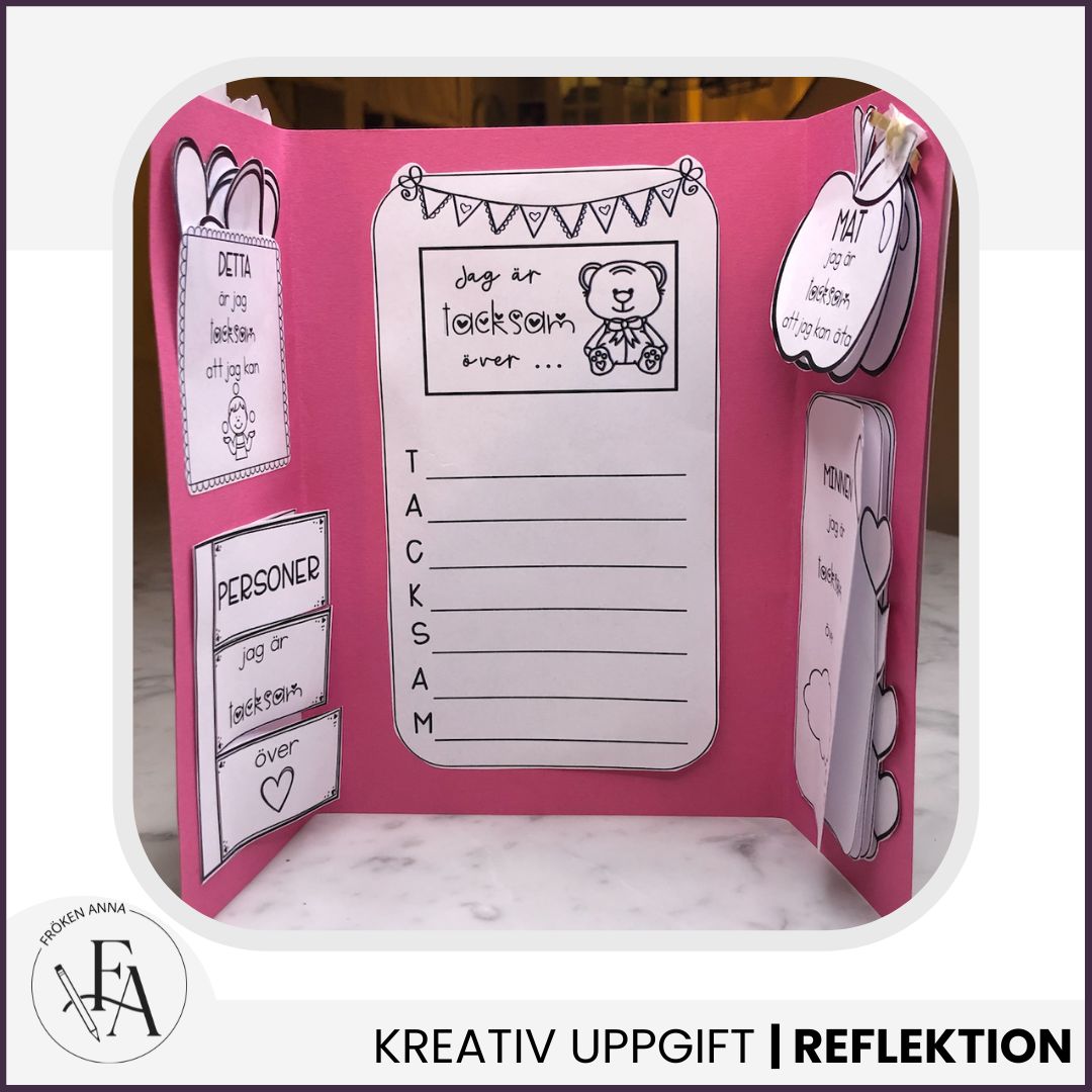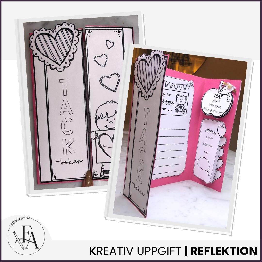 Genom skrivande, ritande och pyssel synliggörs elevernas tankar på ett tryggt och lustfyllt sätt. Tackboken passar perfekt som en värdegrundsövning och bidrar till samtal om känslor, självkänsla och empati.