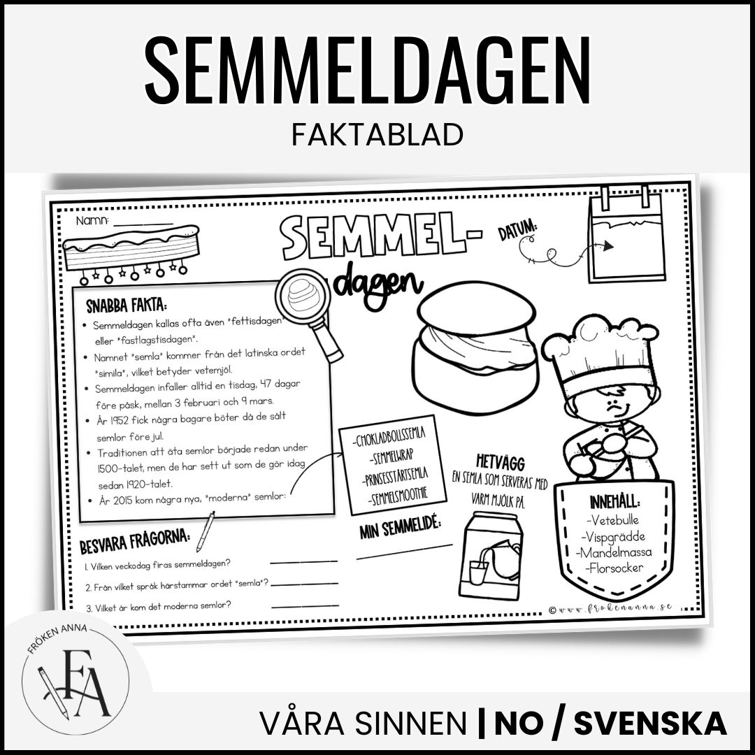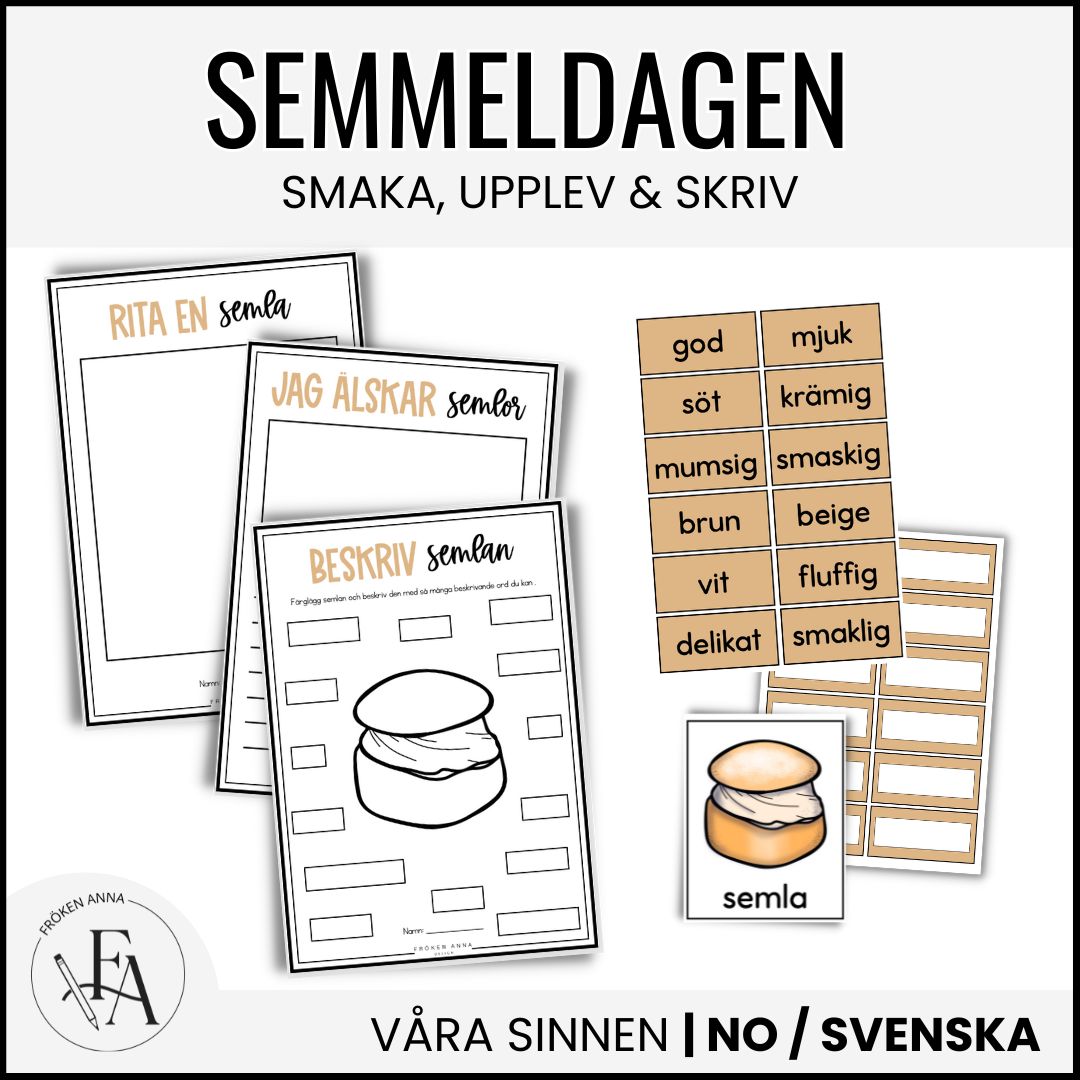 Det här paketel passar perfekt för en mysig och språkutvecklande stund i samband med semmeldagen – där ni kombinerar temadagen med samtal, skrivande och kreativt skapande.