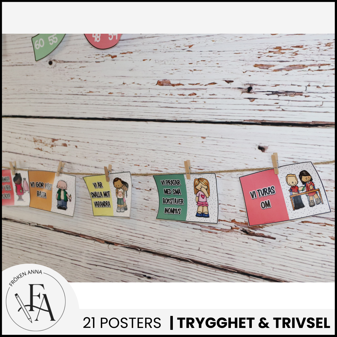 21 trivselregler i färgserien ”bubbelgum”. Materialet levereras som A4, A5 och som mindre kort så välj själv vilken storlek som passar dig och dina elever.