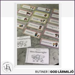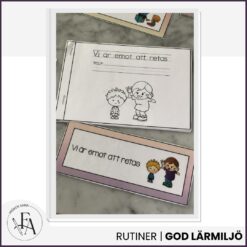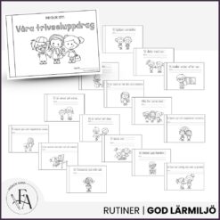 I detta paket ingår 15 skyltar över vanligt förekommande trivseluppdrag/trivselregler i skolan att sätta upp i klassrummet samt en trivselbok med alla uppdrag, en till varje elev.