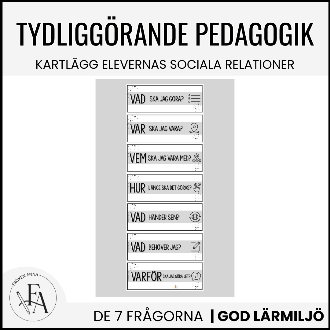 Skyltar med 7 nyckelfrågor till tavlan. Skriv ut, laminera och använd vid varje lektion för att skapa trygghet hos alla elever vilka krav och förväntningar som finns under lektionen