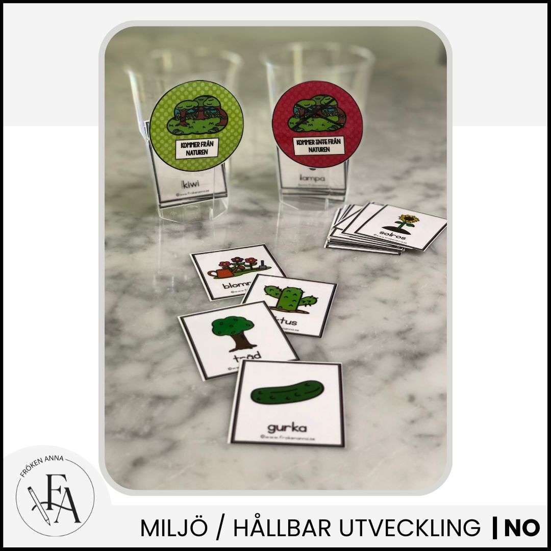 I detta visuella material får eleverna sortera vad som kommer från naturen och inte. Totalt ingår 24 sorteringskort med ord och bild.